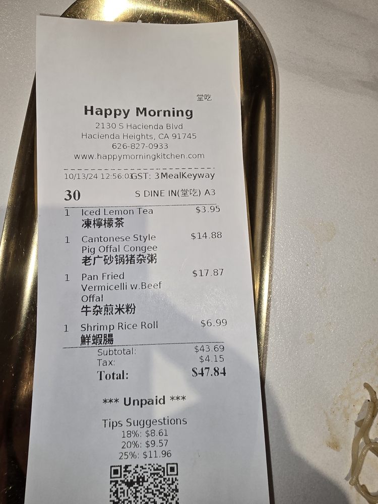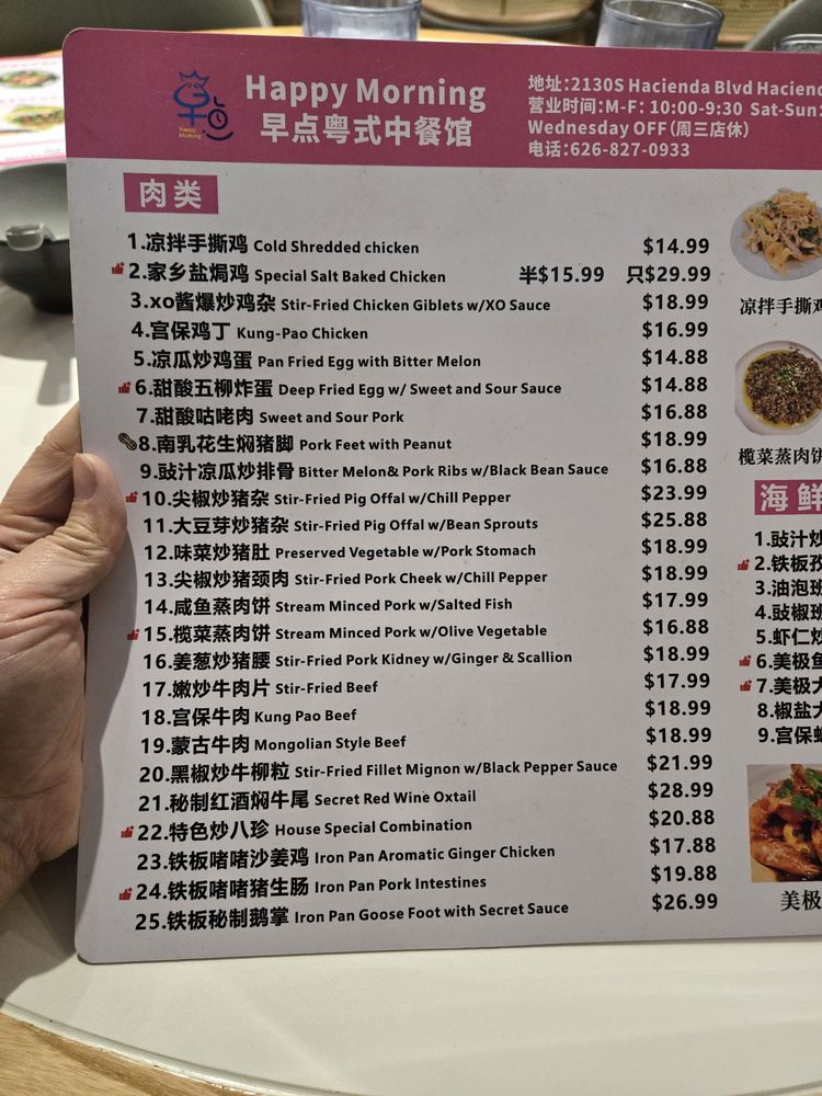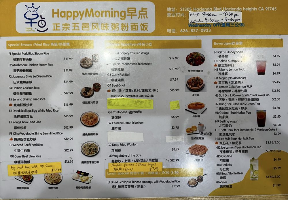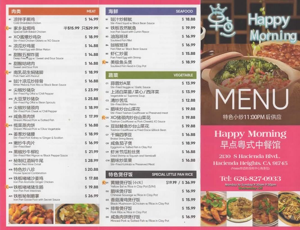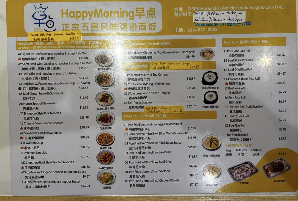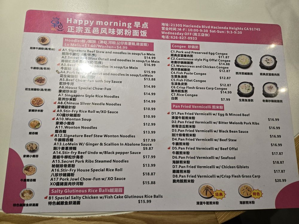 Introducing Happy Morning, a hidden gem in Hacienda Heights offering authentic Cantonese noodles. With a menu that includes flavorful dishes like pan-fried vermicelli, shrimp rice rolls, and Toisanese specialties, this mom-and-pop restaurant delivers on taste and quality. Customers rave about the crispy texture of the vermicelli and the savory flavors of the salty chicken dish. The modern interior, friendly service, and reasonable prices make Happy Morning a must-visit for those craving delicious Cantonese cuisine. Don't miss out on their HK-style milk tea and other cha chaan teng staples. Whether you're a fan of hole-in-the-wall eateries or looking for a unique dining experience, Happy Morning is the perfect place to start your day with a satisfying meal. Visit them at 2130 S Hacienda Blvd or call (626) 827-0933 for reservations or takeout.
